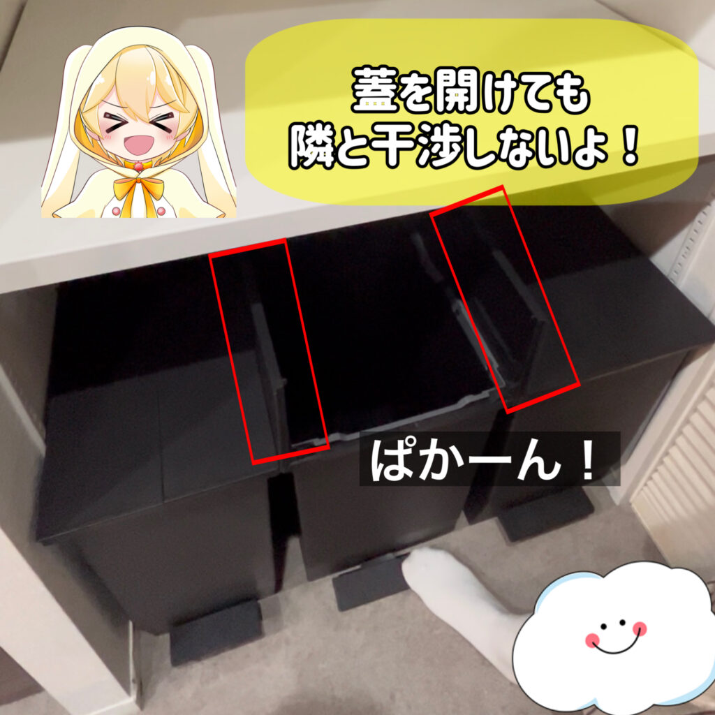 画像のようにゴミ箱の蓋を開けても、お互いに干渉せずにゴミを捨てることができます!